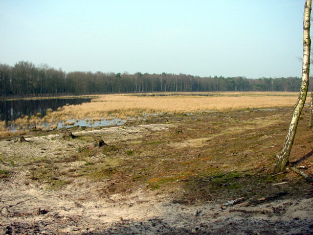 Uitzicht over het van hier uit rechter gedeelte van het meertje ik had geen geluk er was weinig te zien op dat moment althans terwijl er normaliter veel vooral watervogels zijn te bewonderen.